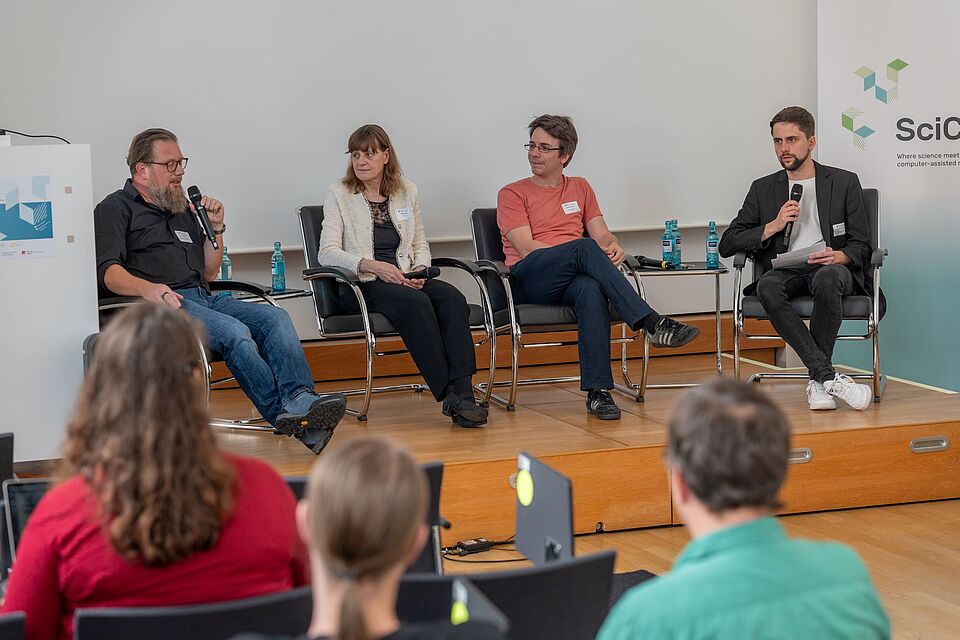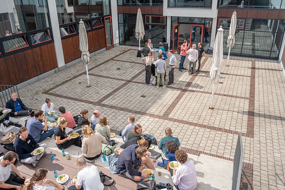 Neben den fachlichen Inputs bot die SciCAR in diesem Jahr selbstverständlich auch wieder die Möglichkeit des direkten, informellen Austauschs. Und so wurde bei – pünktlich zur Mittagspause aufkommenden – strahlendem Sonnenschein im Innenhof des Erich-Brost-Hauses gegessen, genetzwerkt und gelacht. Und zum Abschluss des Konferenztages traten Teams aus Teilnehmenden, Gästen und Referent:innen wieder beim KI-Pubquiz unter Federführung von Jan Eggers gegeneinander an. Oder wie es Angeline Hofacker vom Informationsdienst Wissenschaft ausdrückte: „Hat Spaß gemacht und wirkt nach!“
